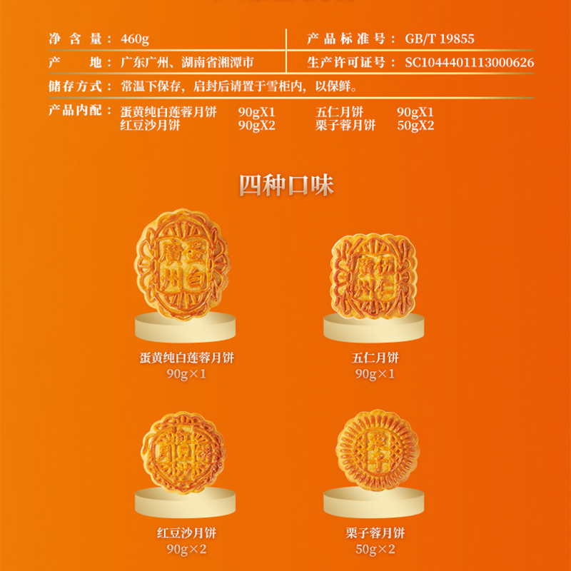 广州酒家广州经典月饼,奉上四款经典广式味道,自然清香,皮薄酥软,口感绵实,是一款独属于广式月饼的传统韵味。净重460克,蛋黄纯白莲蓉月饼 90g×1 ; 五仁月饼 90g×1;红豆沙月饼 90g×2 ; 栗子蓉月饼 50g×2