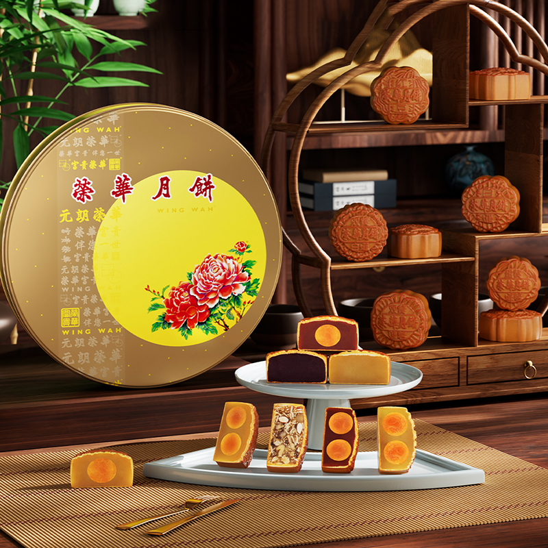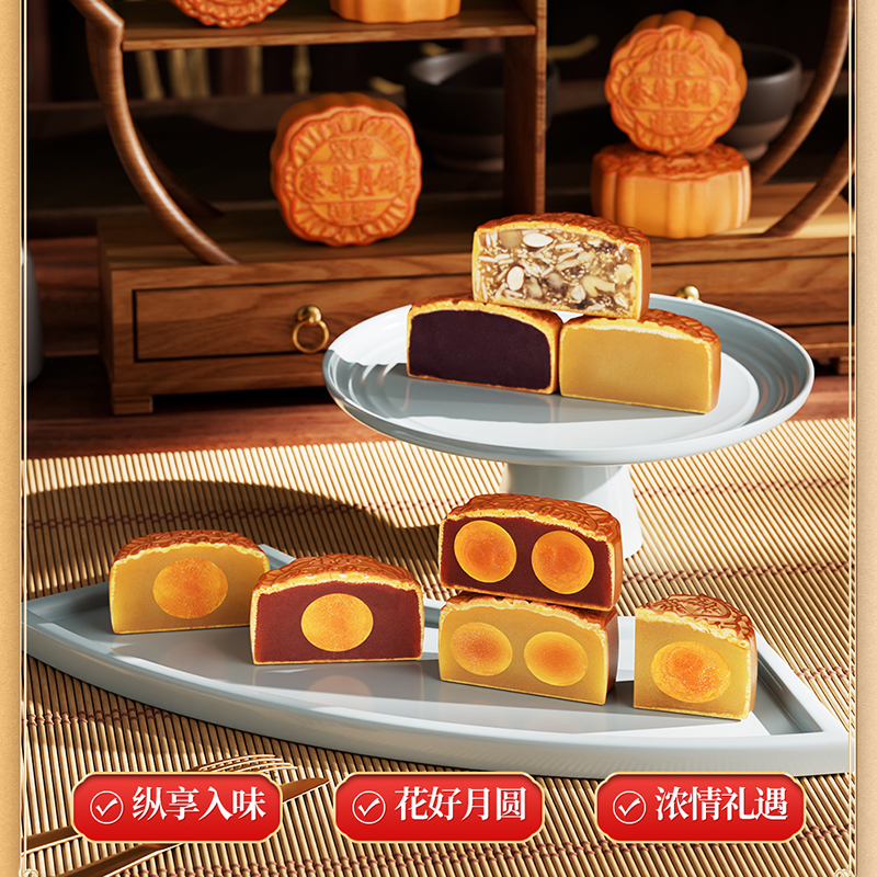 元朗荣华七星伴月月饼,一盒尽享元朗荣华经典八种口味月饼。情郁味浓、合家欢享。内容物包含三黄白莲蓉月饼 185g×1枚;双黄白莲蓉月饼 185g×1枚;双黄莲蓉月饼 185g×1枚;蛋黄白莲蓉月饼 185g×1枚;蛋黄莲蓉月饼 185g×1枚;纯正白莲蓉月饼 185g×1枚;纯正红豆月饼 185g×1枚;纯正五仁月饼 185g×1枚;饼皮色泽金黄松软匀薄顺滑软糯甘香,由元朗荣华自建湖南“寸三莲”基地,精选浑圆饱满的莲子经过多次研磨、过筛、炒制等多重工艺莲香四溢,口感粉糯松软,与咸蛋黄相呼应!白莲蓉馅料(莲子添加量100%)清香怡人口感紧实、细腻柔滑纯香白莲蓉。慢火熬煮出的细腻莲蓉配上口感松软的饱满流油咸香丰盈的咸鸭蛋黄,给予味蕾中秋的滋味。经典圆形铁罐搭配花好月圆图案,外装精美礼盒!中秋佳礼,高档大气,馈赠珍选!中秋送月饼、企业集采团购批发-送货上门、灵活开票!